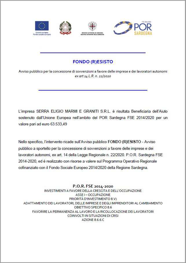 L'impresa SERRA ELIGIO MARMI E GRANITI S.R.L. è risultata Beneficiaria dell'Aiuto sostenuto dall'Unione Europea nell'ambito del POR Sardegna FSE 2014/2020 per un valore pari ad euro 63.533,49